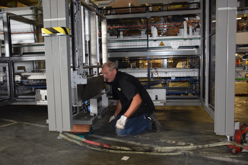 .....daar nog met behulp van de heftruck, de robotarmen bevestigen en klaar is Kees. In de dagen daarna tenslotte wordt de machinelijn geheel afgemonteerd door de leverancier.